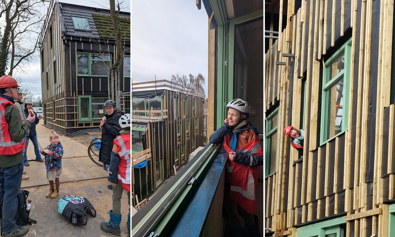 Na het binnenkijken bij de appartementen konden op vrijdag 27 maart eindelijk ook de buren van de rijtjeshuizen een kijkje nemen. Vier gezinnen stapten, met rode helmen, hesjes en een appelflap in de hand, voor het eerst over de drempel van de groene voordeuren aan de Elzenstraat.